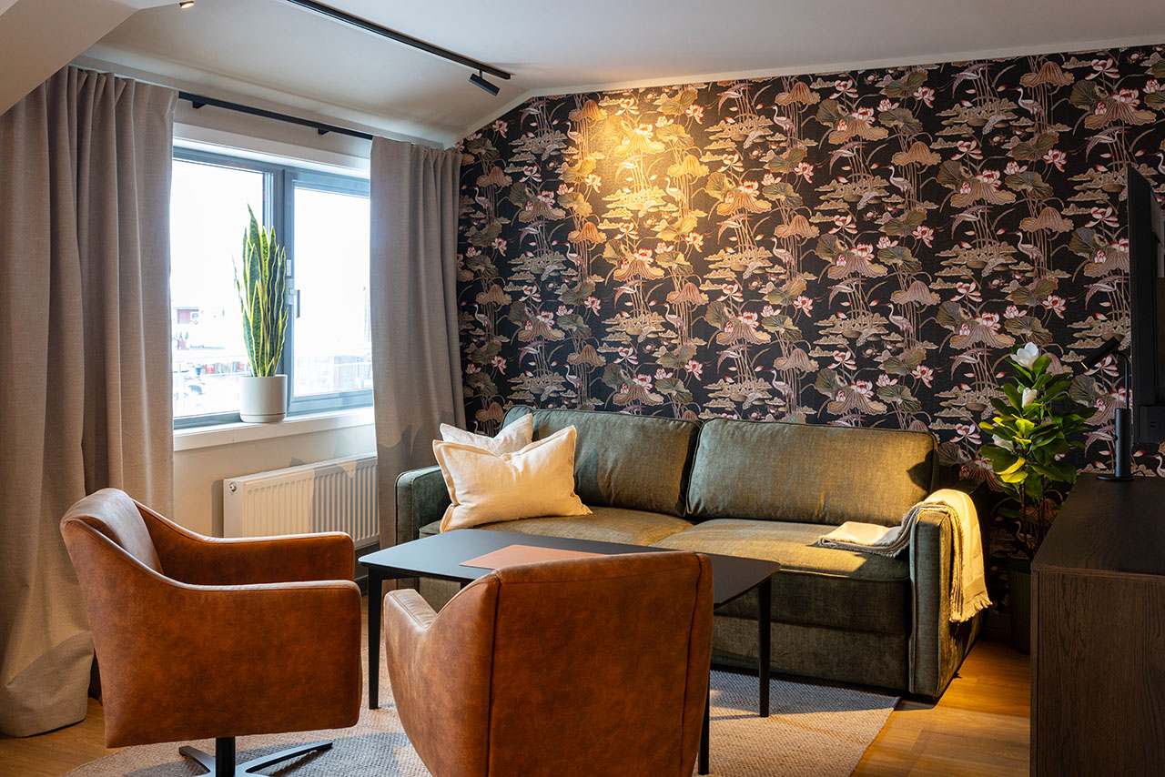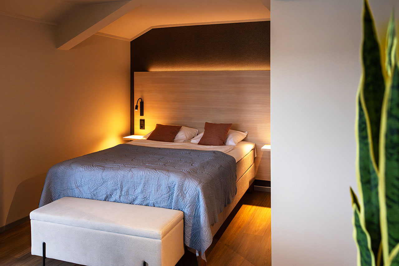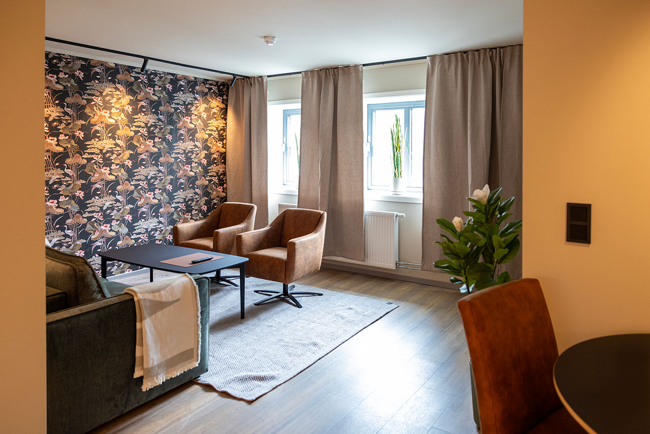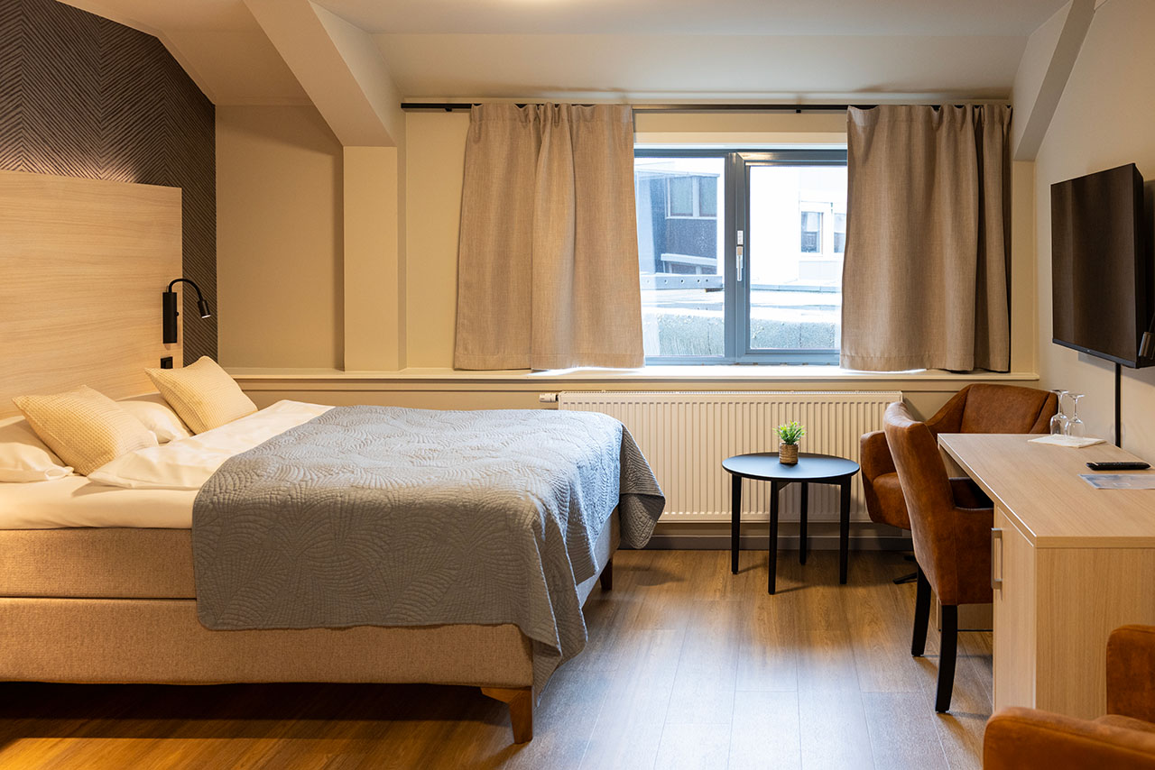 Vårt lille hotell har 11 nyoppussede rom og 3 romslige leiligheter – alle med gjennomført stil, gode senger og en lun atmosfære. Flere av rommene har egen balkong, med utsikt mot bysentrum.